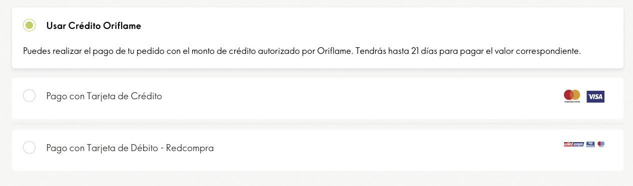 IMPORTANTE: Si tu pedido excede el monto disponible de tu crédito Oriflame, deberás usar la opción de Pago con tarjeta de crédito o débito por el total del monto de tu compra.