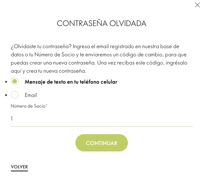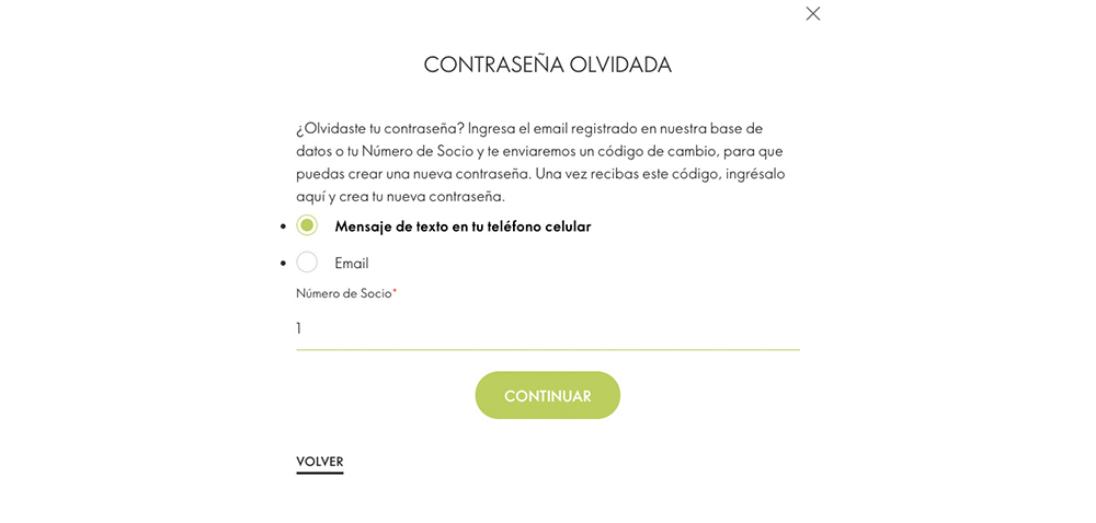 Selecciona el medio por el cual deseas recibir el código de cambio de contraseña (vía Mensaje de texto o Email). Ingresa tu Código de Socio y haz clic en “Continuar”.