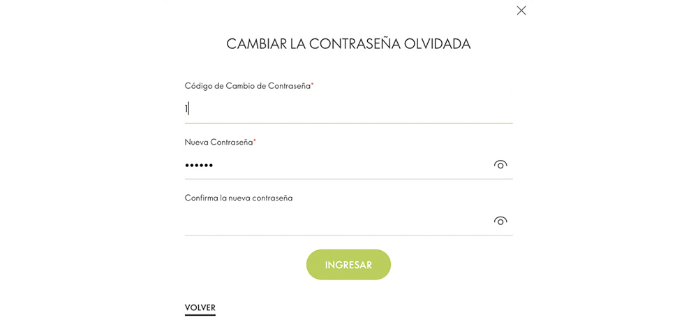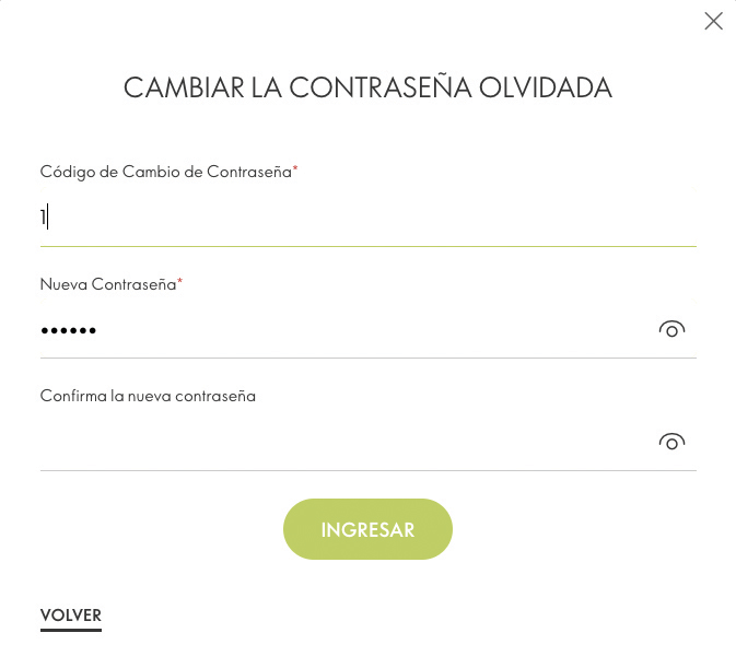 Recibirás el código del cambio de contraseña por el medio que hayas seleccionado anteriormente. Ingrésalo y establece tu nueva contraseña. Haz clic en “Ingresar”. La nueva contraseña que acabas de establecer, será la que debes usar para tu ingreso como Socio.