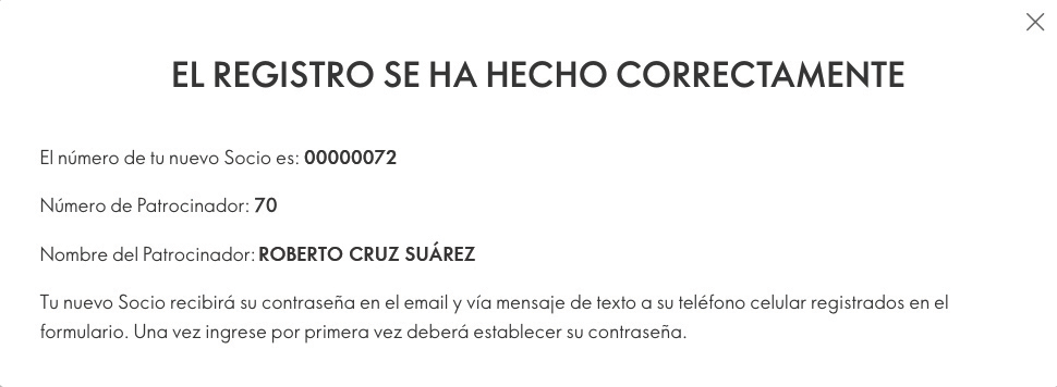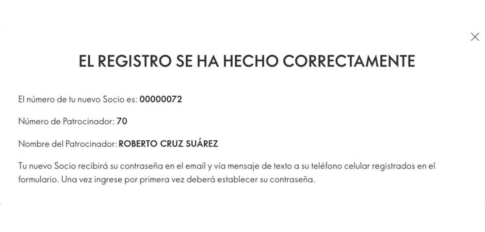 Recibirás la confirmación del registro con el código del nuevo Socio.